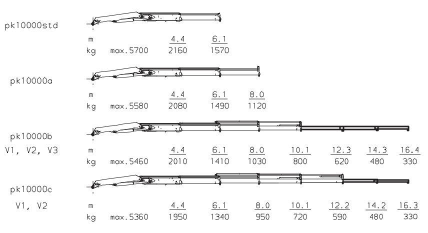 Характеристики модифікацій на кран-маніпулятор Palfinger PK 10000 Performance