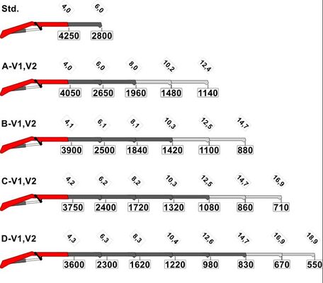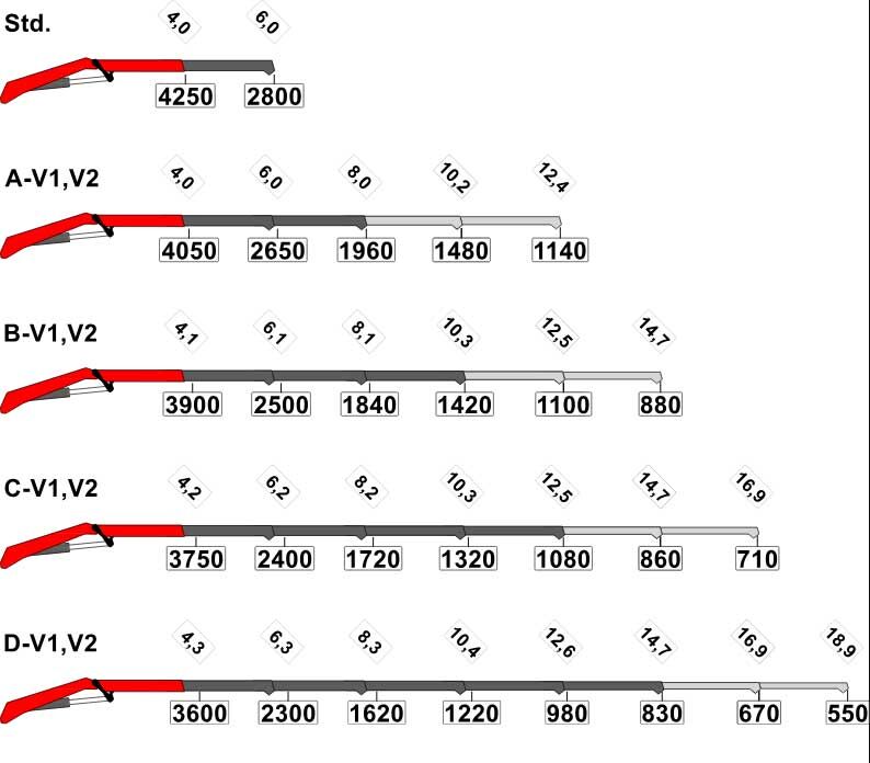 Вказані вильоти стосуються кута нахилу стріли 20° і тому не є максимальними. Під час використання механічних подовжувачів стріли навантаження, зазначені на діаграмах, необхідно зменшити на вагу цих подовжувачів.
