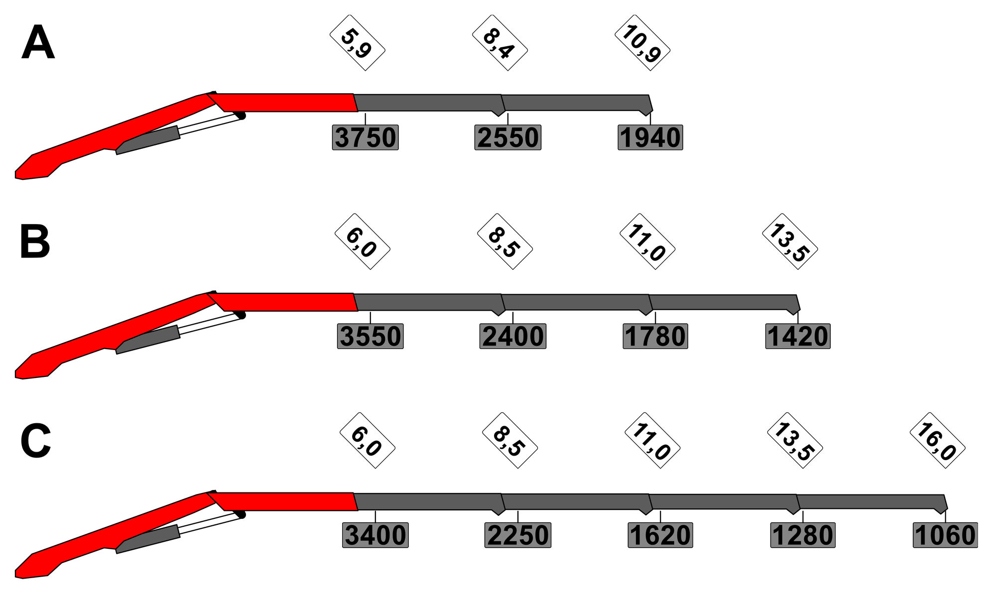 Вказані вильоти стосуються кута нахилу стріли 20 ° і тому не є максимальними. Під час використання механічних подовжувачів стріли навантаження, зазначені на діаграмах, необхідно зменшити на вагу цих подовжувачів.