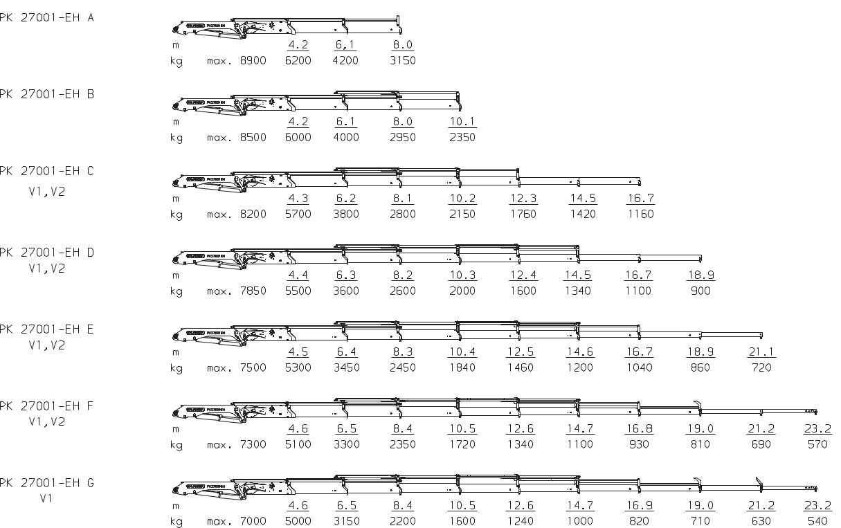 Характеристики модифікацій на кран-маніпулятор Palfinger PK 27001-EH High Performance