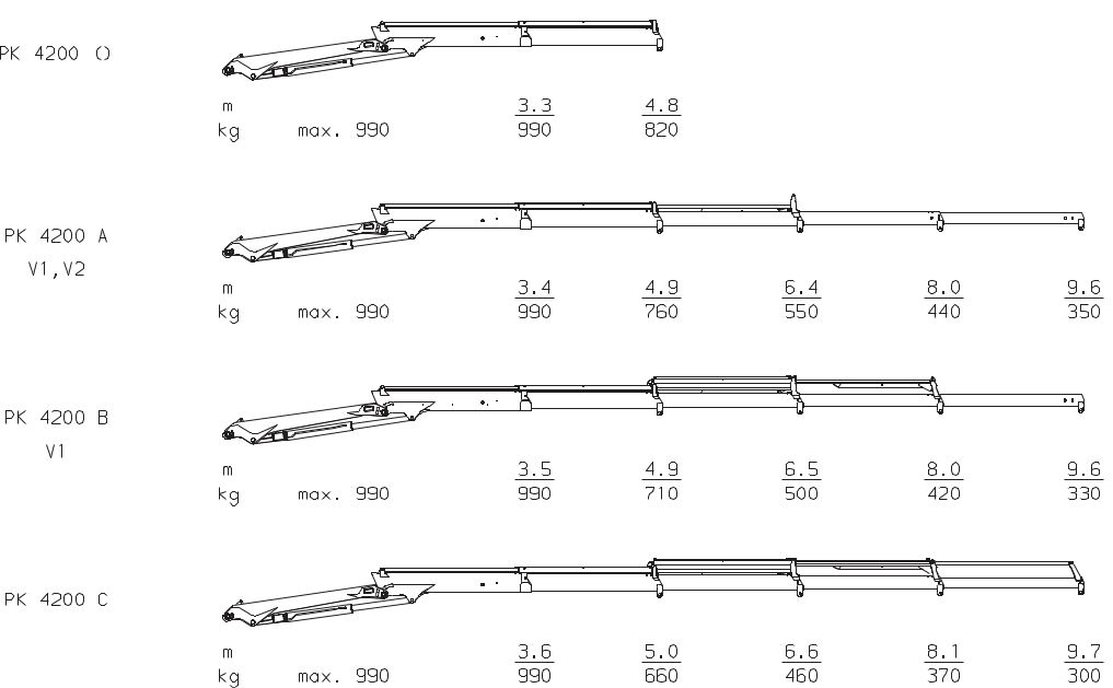 PK 4200 A V1, V2 | 3,7 тм | 9,6 м | 990 кг | 350 кг | 370 º | 545 кг | Дізнатись ціну |