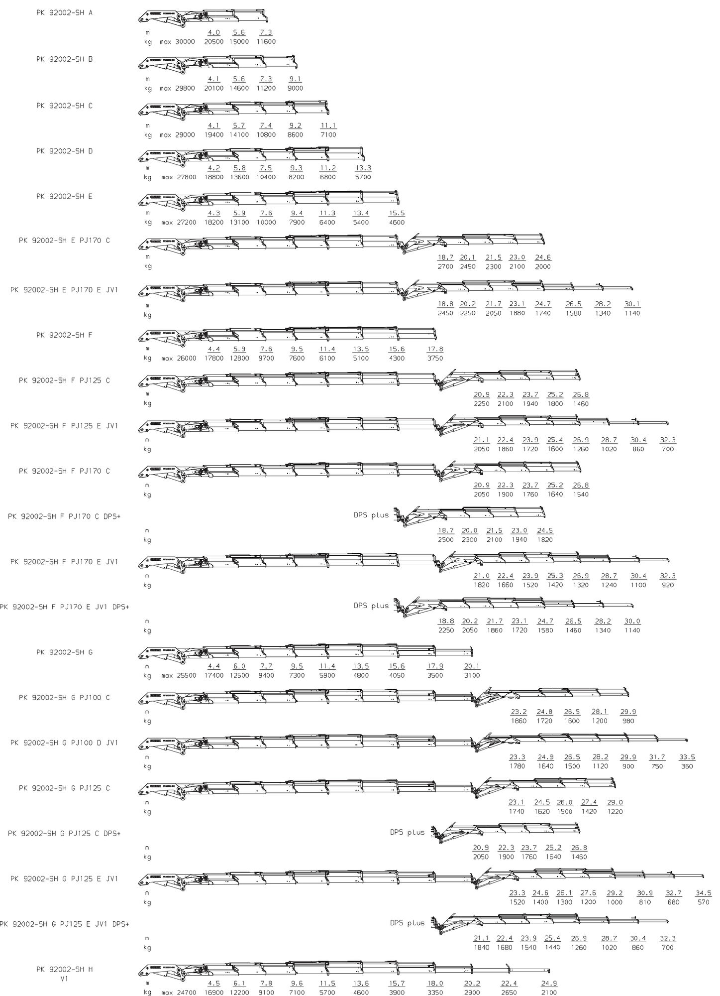 Вказані вильоти стріли розраховані для кута нахилу стріли 20° і тому не є максимальними. При використанні механічних подовжувачів стріли навантаження, зазначені на діаграмах, необхідно зменшити на вагу цих подовжувачів.