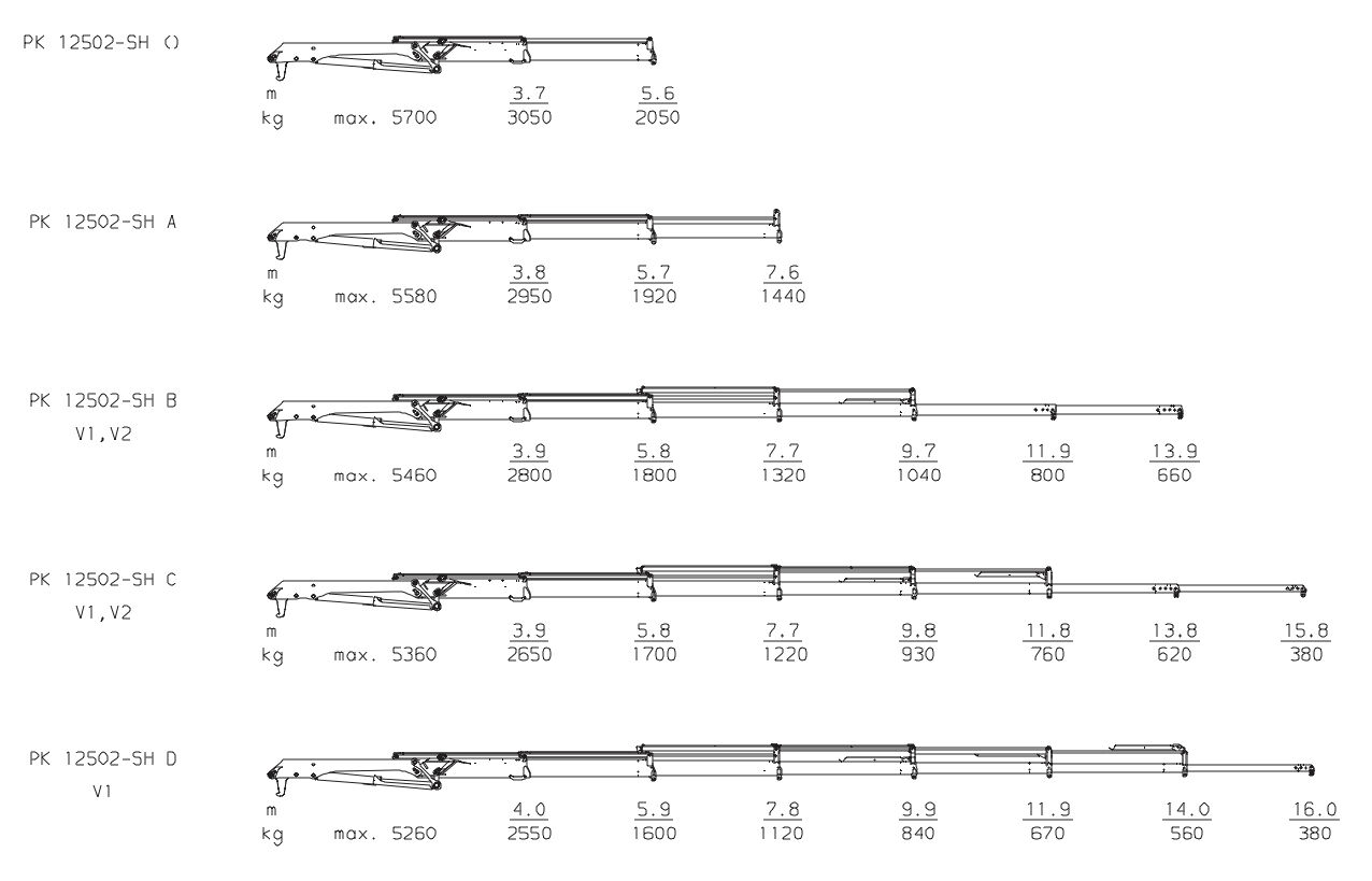 PK 12502 SH B V1, V2 | 10,7 тм | 13,9 м | 5460 кг | 660 кг | 400 º | 2150 кг | Узнать цену |