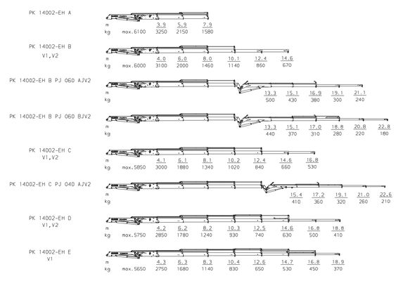 PK 14002-EH B V1, V2 | 12,5 тм | 14,6 м | 6000 кг | 670 кг | 420 º | 1922 кг | Узнать цену |