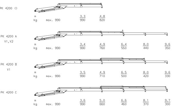 PK 4200 B V1 | 3,6 тм | 9,6 м | 990 кг | 330 кг | 370 º | 595 кг | Узнать цену |