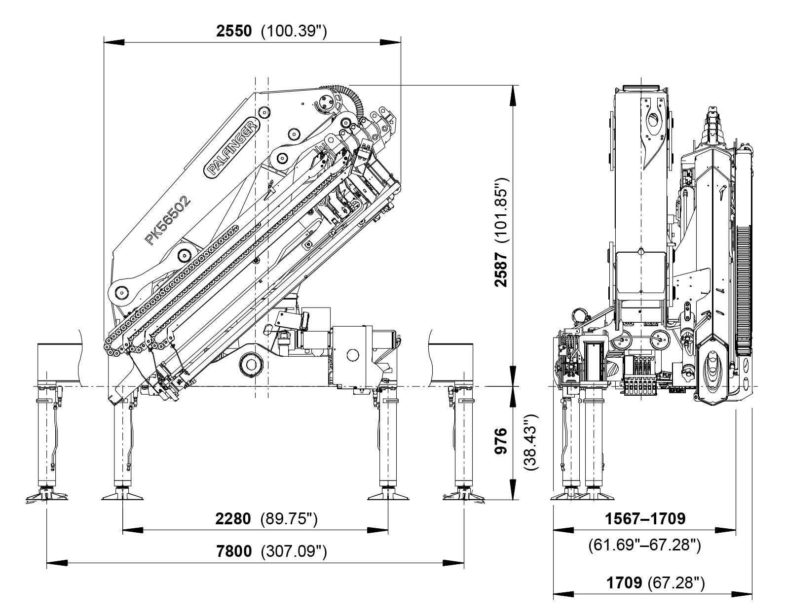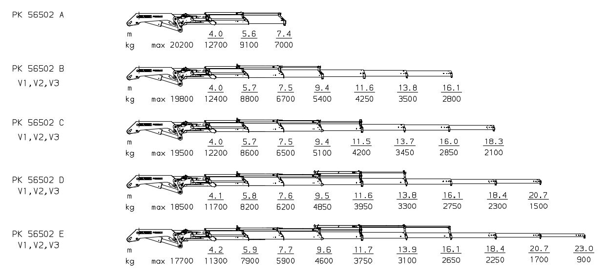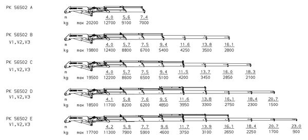 PK 56502 E V1, V2, V3 | 42,7 тм | 23,0 м | 17700 кг | 900 кг | 370 º | 6119 кг | Узнать цену |