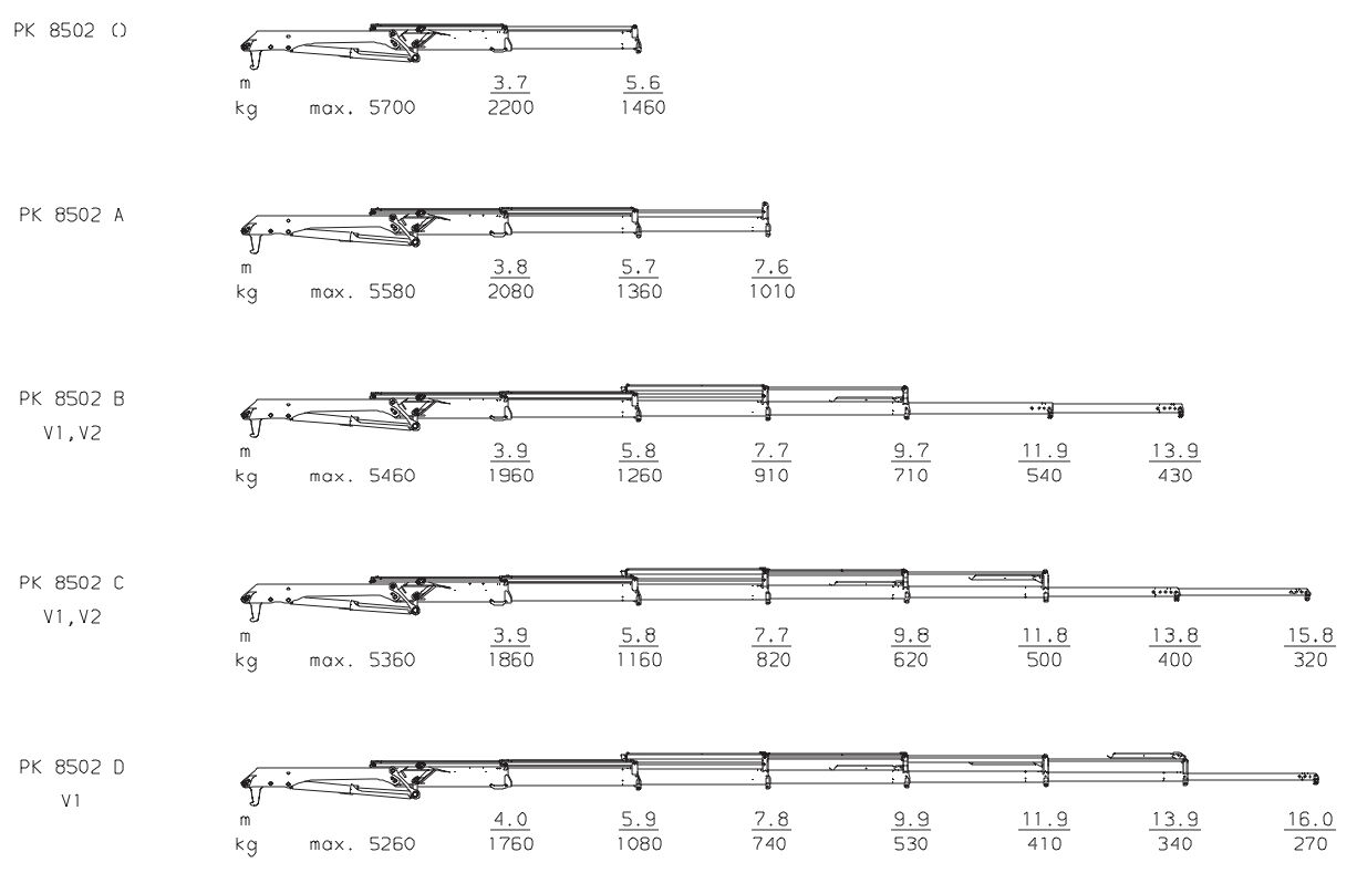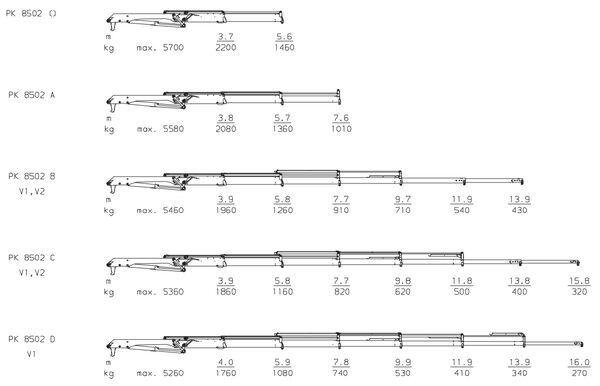 PK 8502 B V1, V2 | 7,6 тм | 13,9 м | 5460 кг | 430 кг | 400 º | 1246 кг | Узнать цену |